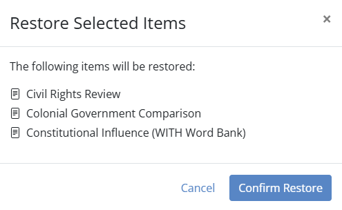 Click the box to the left of any deleted Activity. When you select Restore, a confirmation pop-up will appear.