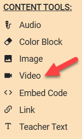 Start by clicking +Insert or drawing a box onto your Assignment. From the menu that appears, choose Video under Content Tools.